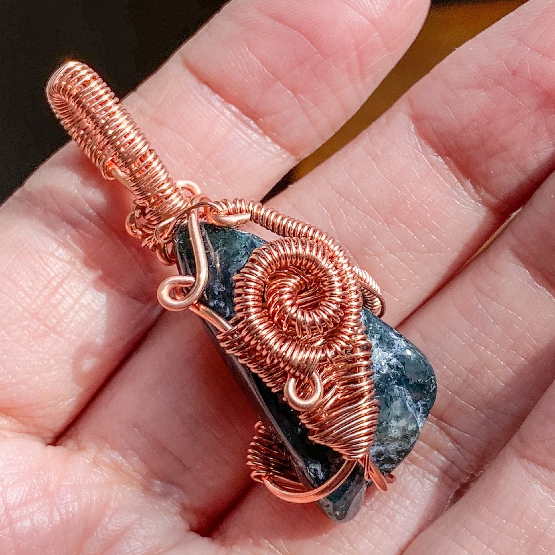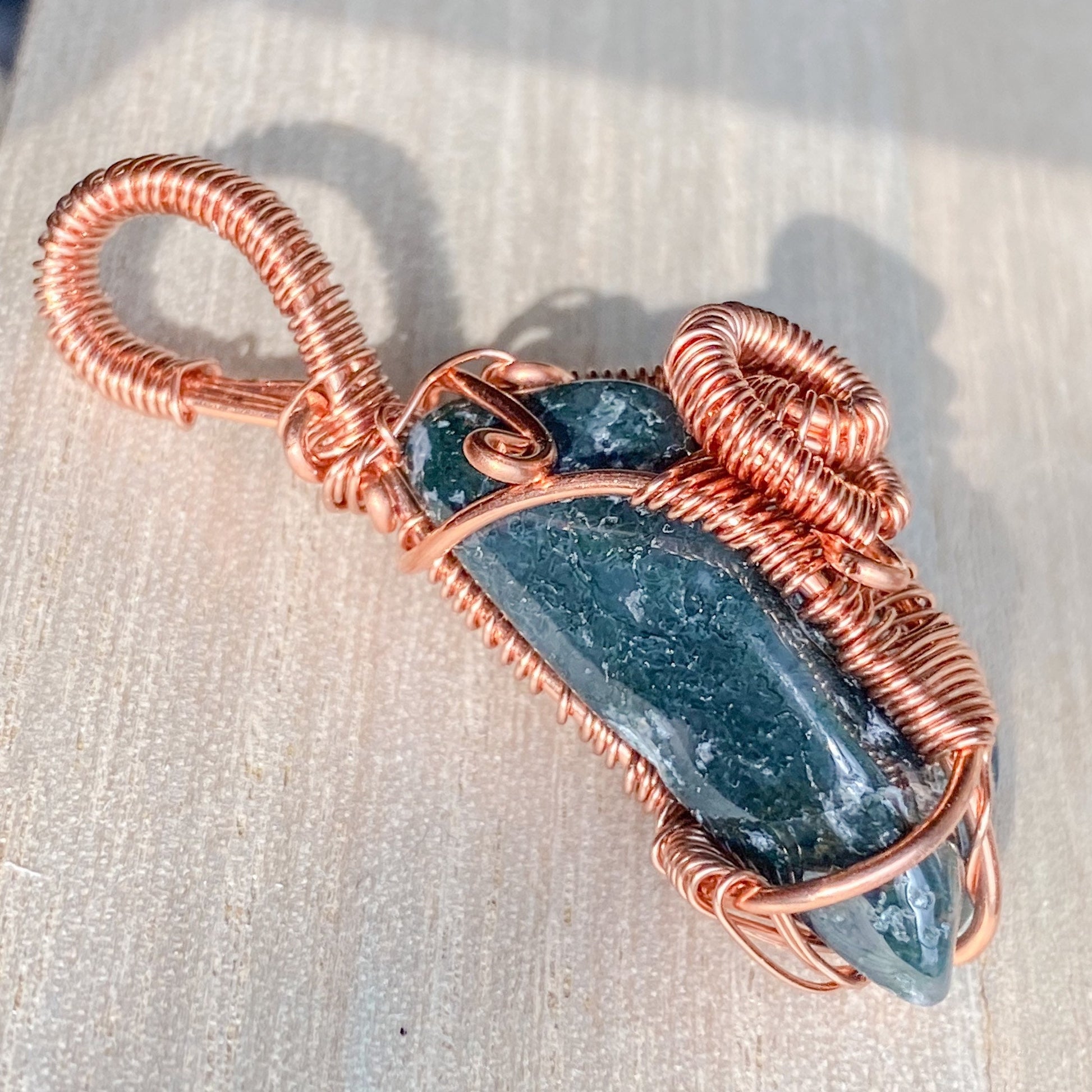 Abundance in New Beginnings Moss Agate Copper Wire wrapped Pendant
