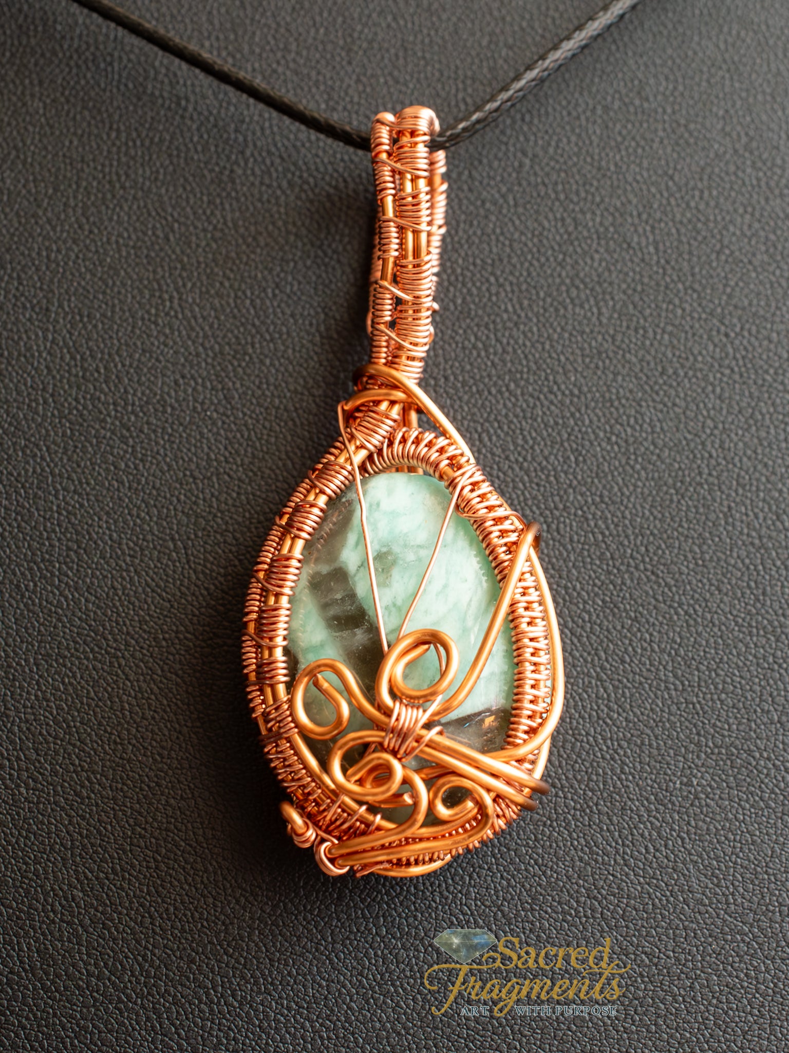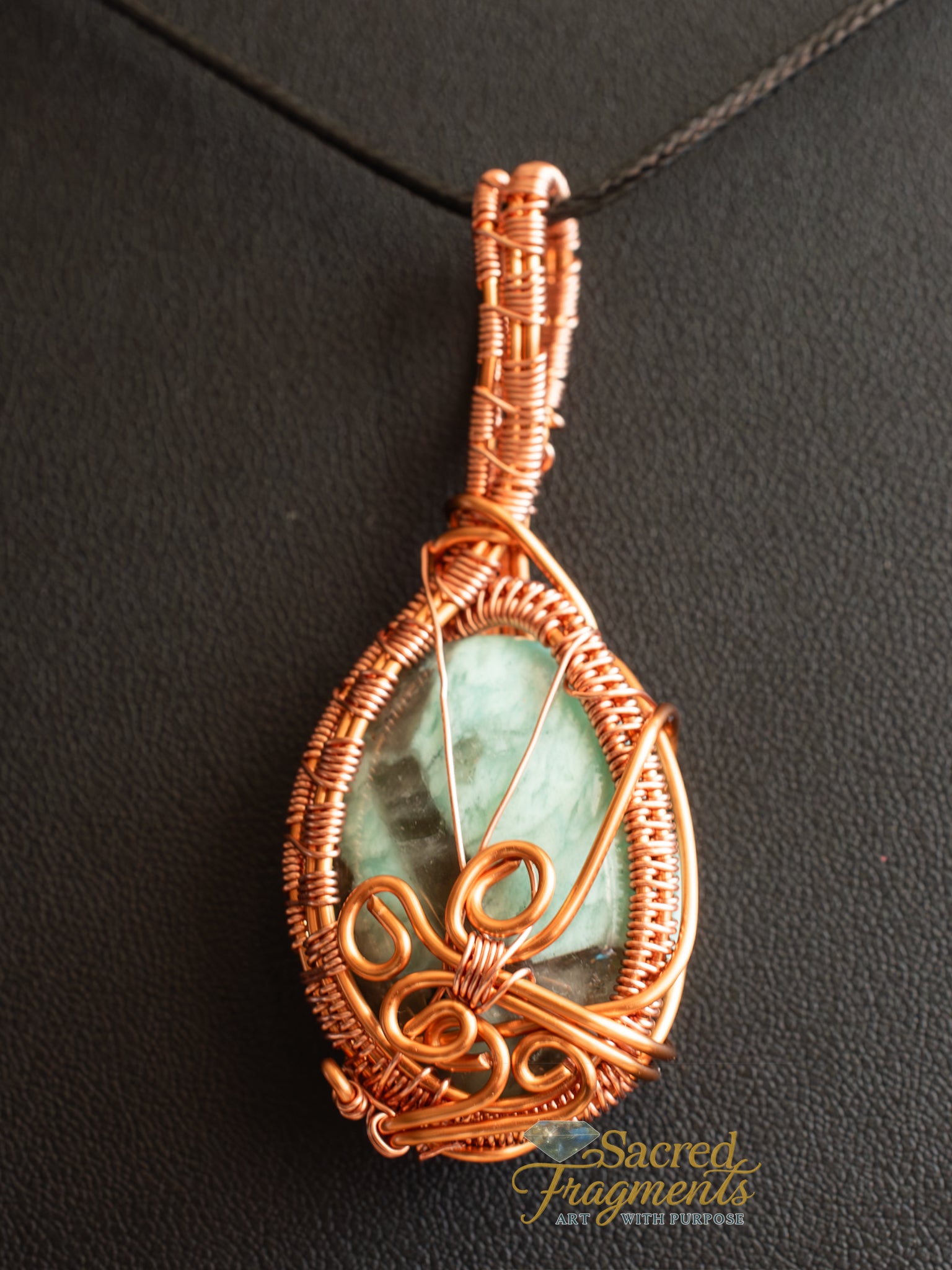 As a potent conductor of energy, the copper intricately wrapped around the Amazonite intensifies, enhances, and channels the stone's soothing and lucky properties. Copper is believed to increase vitality, assist the body with repairing tissues, and promote oxygenation of the blood. The warm metal complements the stone's cool tones and strengthens its overall energetic output.