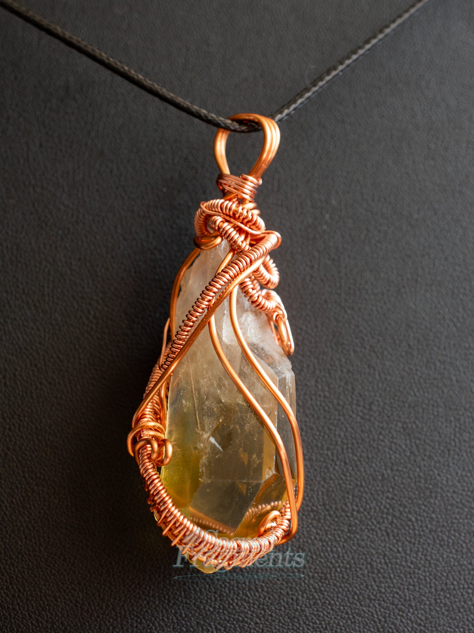 The pure copper wire is intricately wrapped to securely cradle the quartz point. Copper is traditionally recognized as an essential energetic conductor that amplifies and channels the crystal's vibrational frequency, maximizing the stone's combined grounding and manifesting energies. The rich, warm metal enhances the golden tones of the Citrine and adds a strong, earthy element to the piece.