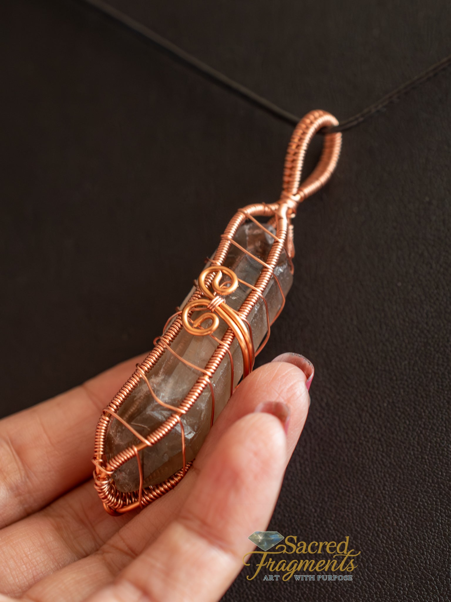 This striking, naturally terminated point of Smoky Elestial Quartz is meticulously wire-wrapped in pure, conductive copper. It is specifically designed to be an ally during times of intense change and spiritual awakening, helping you stay centered, protected, and fully present while integrating higher cosmic insight.