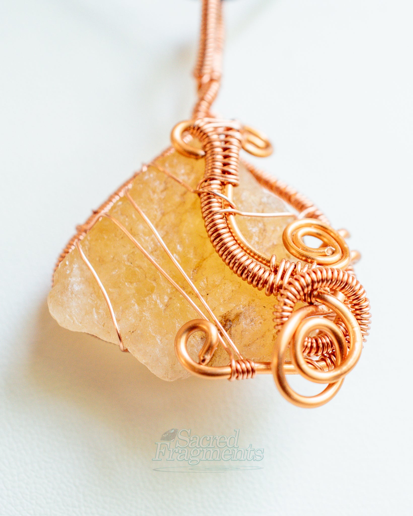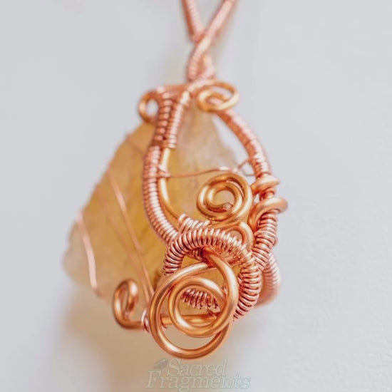 The pure copper wire is intricately wrapped to securely cradle the . Copper is traditionally recognized as an essential energetic conductor that amplifies and channels the crystal's vibrational frequency, maximizing the stone's combined grounding and manifesting energies. The rich, warm metal enhances the golden tones of the Citrine and adds a strong, earthy element to the piece.