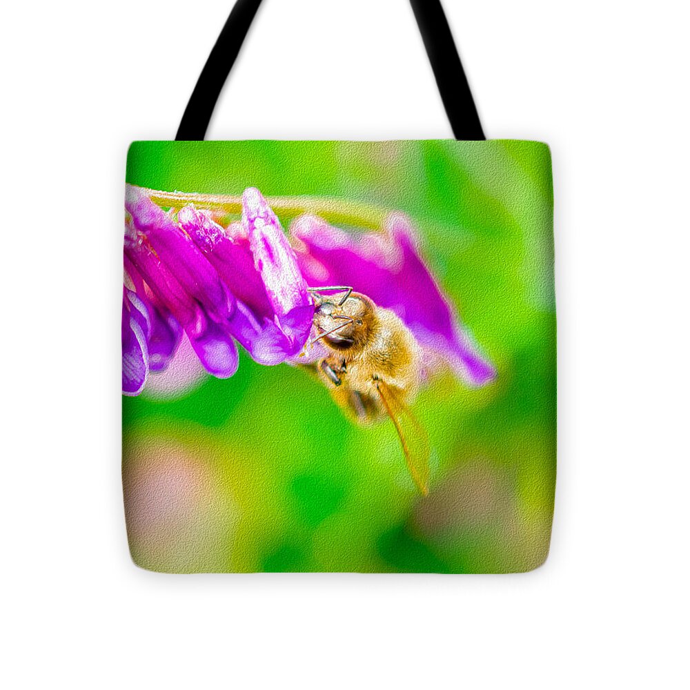 Macro Bee on a Purple Flower with Green Background - Tote Bag