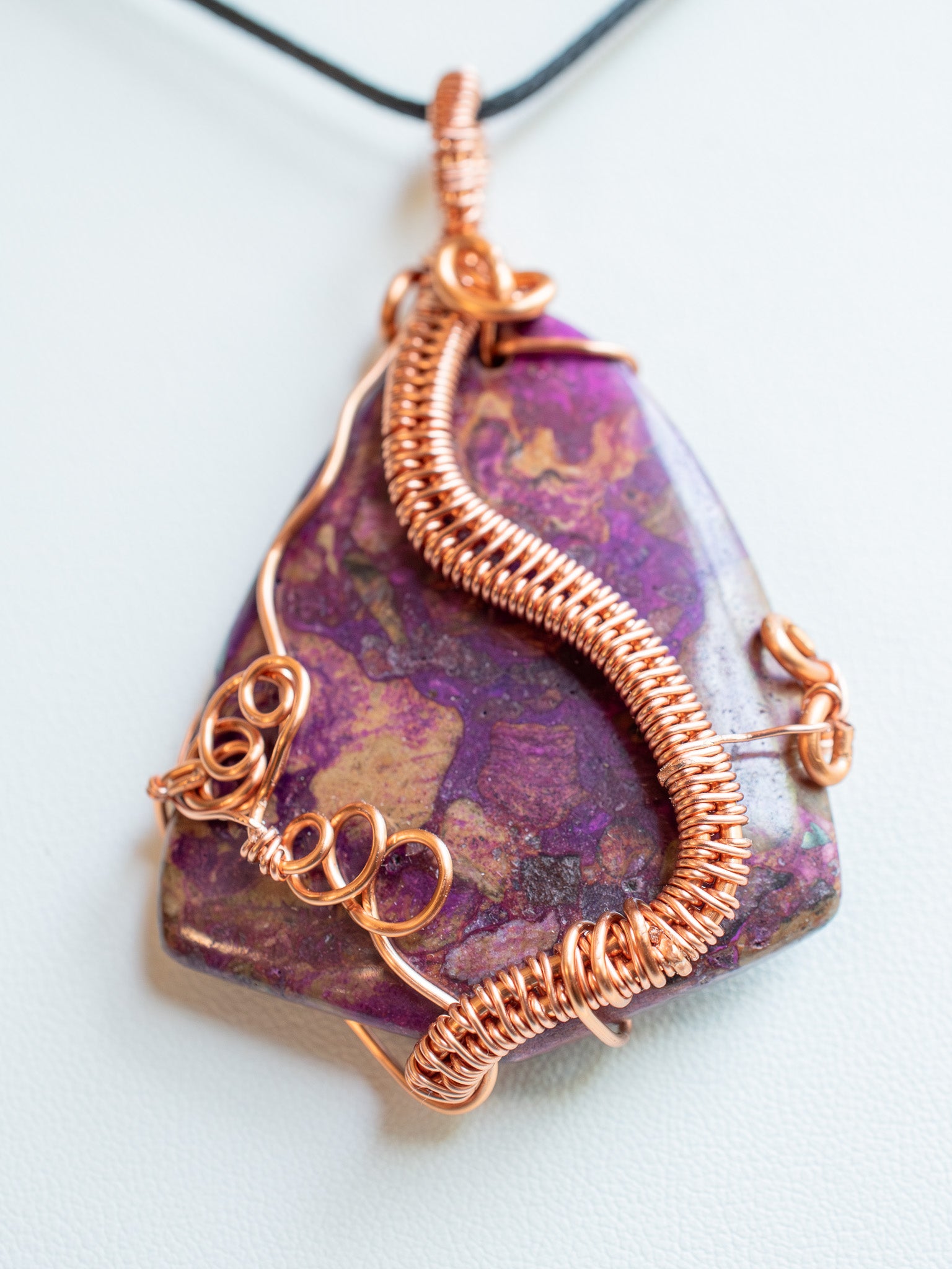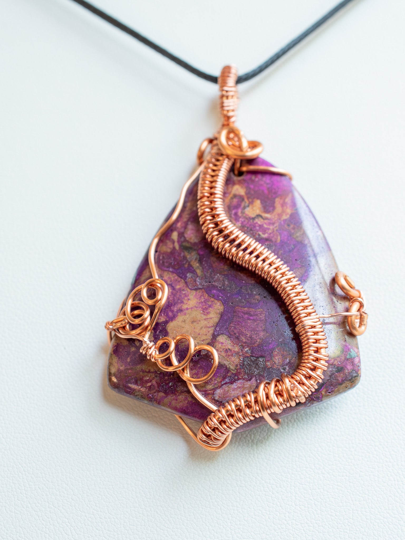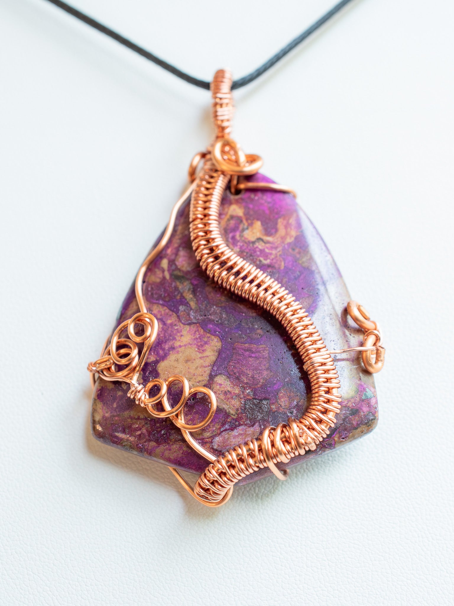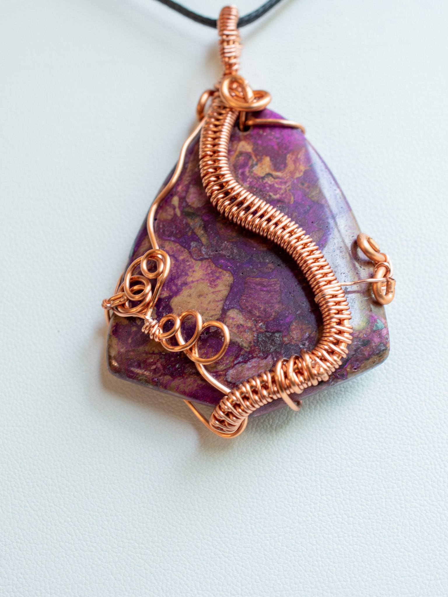 But the magic doesn't stop there! This powerful stone is meticulously hand-wrapped in polished copper wire, enhancing its natural beauty and adding a touch of rustic elegance. Copper is known for its conductive properties, amplifying the stone's energy and adding a warm, grounding touch.