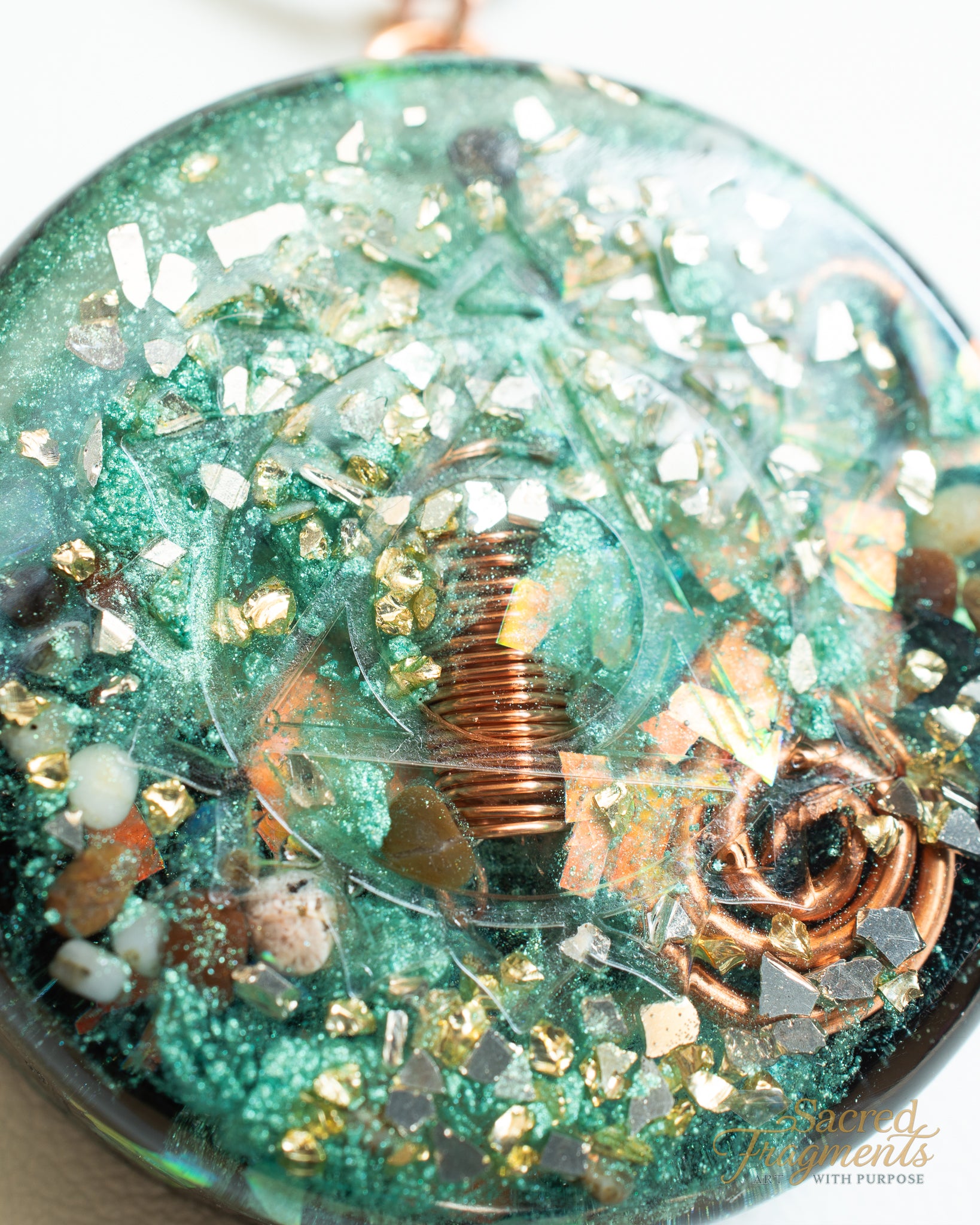 Style: Hand-poured Orgonite pendant featuring a clear quartz wrapped in copper, beach stones/crystals, copper wire, and Shungite stone.