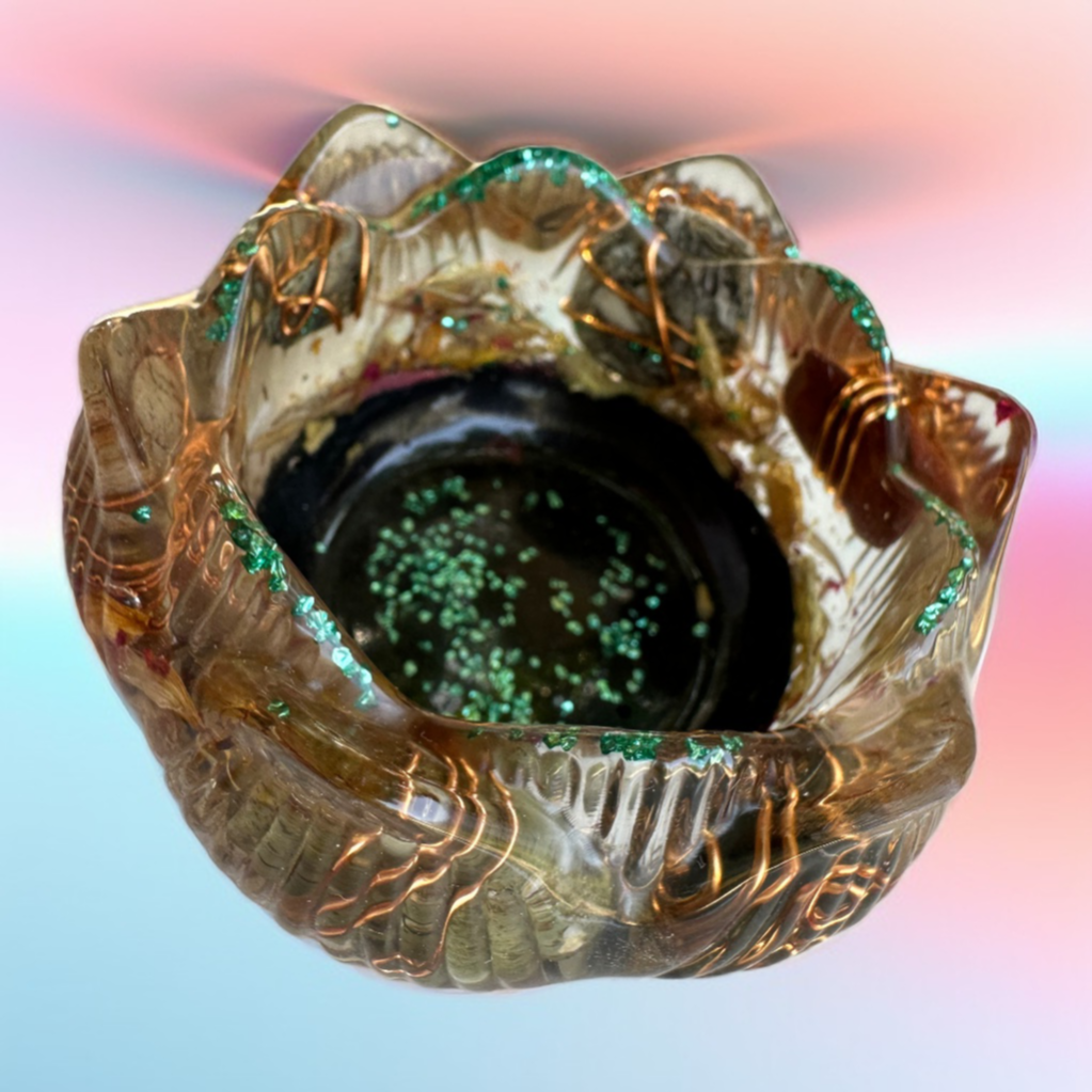 💎 Within its golden-copper depths lie crystals 🔮 or smooth beach stones 🪨, each lovingly wrapped in copper wire 🌀 to amplify their natural vibrations. Suspended in shimmering resin ✨, they seem to float like celestial bodies 🌌 in a cosmic sea. Glitter, crushed crystals, and golden flakes 🌟 dance in the light, turning every glance into a moment of wonder.