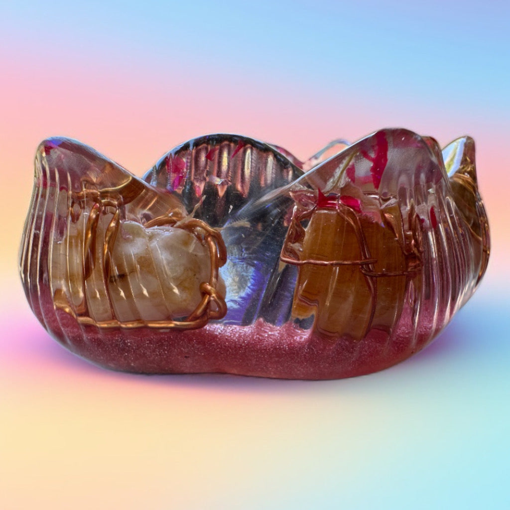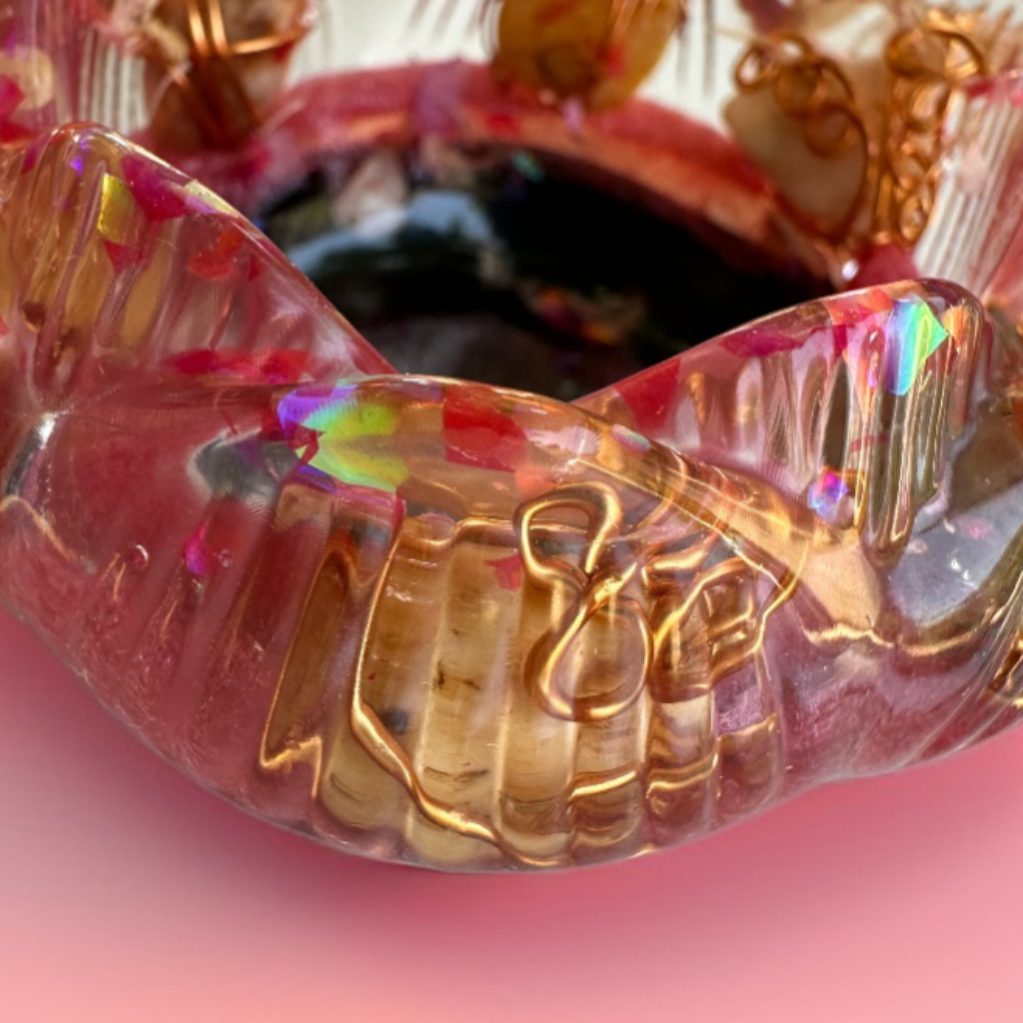 💎 Within its golden-copper depths lie crystals 🔮 or smooth beach stones 🪨, each lovingly wrapped in copper wire 🌀 to amplify their natural vibrations. Suspended in shimmering resin ✨, they seem to float like celestial bodies 🌌 in a cosmic sea. Glitter, crushed crystals, and golden flakes 🌟 dance in the light, turning every glance into a moment of wonder.